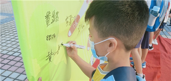 秋風(fēng)送爽,涼風(fēng)習(xí)習(xí)。9月1日早上,孩子們踏入校園,在迎新墻上書寫的簽名與朝陽互映生輝,折射出了新的希望。