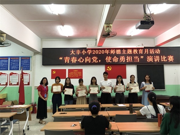 為了進(jìn)一步加強(qiáng)師德師風(fēng)建設(shè),全面提升教師思想政治素質(zhì)和職業(yè)道德水平,努力造就一支師德高尚、業(yè)務(wù)精湛、充滿活力的高素質(zhì)教師隊伍,10月12日下午,大豐小學(xué)結(jié)合“不忘初心,牢記使命”師德建設(shè)主題教育月活動舉行了一次“青春心向黨,使命勇?lián)?dāng)”的演講比賽。