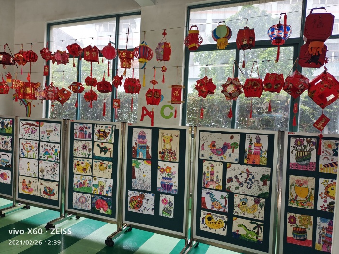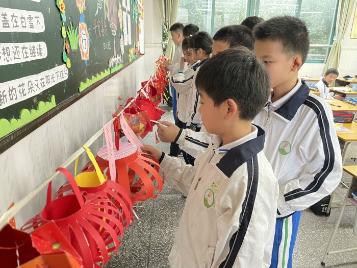 元宵節(jié)怎么能離得了燈籠呢。瞧!班級里掛著同學(xué)們親手制作的燈籠,一盞盞富有創(chuàng)意,制作精巧,讓同學(xué)們不由得駐足觀看,整個校園洋溢著濃濃的節(jié)日氣氛。