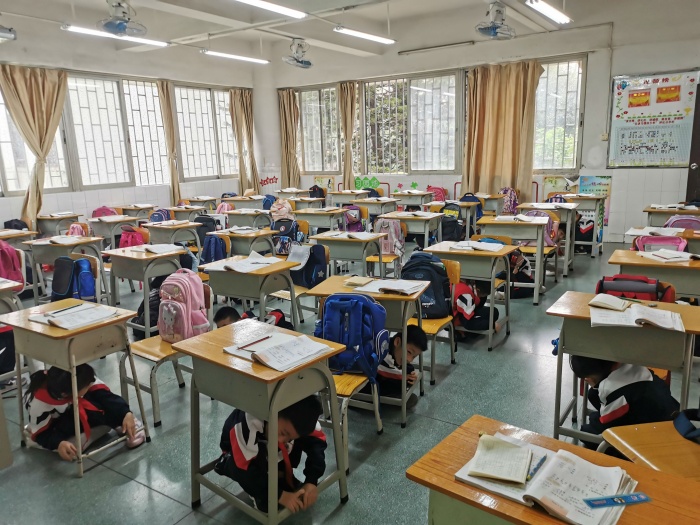 演練的前一天,學校已經通過廣播系統(tǒng)跟同學們熟悉了地震與消防的預警音樂。為了考驗同學們,學校并沒有提前告知師生此次演練活動的時間,學生像往常一樣上課。在大家都在用心聆聽講課時,校園里忽然響起了地震的警報聲。聽到警報聲后,同學們像訓練有素一樣,紛紛蹲到課桌底下。待地震的警報聲結束時,校園里響起了火災的警報聲,各個上課的老師馬上帶領學生彎著腰,捂住口鼻,沿著學校指定樓梯通道快速撤離到學校操場的安全地帶。待全體師生都撤離到操場后,各班主任清點人數(shù)并向麥彩英副校長上報人數(shù)。
