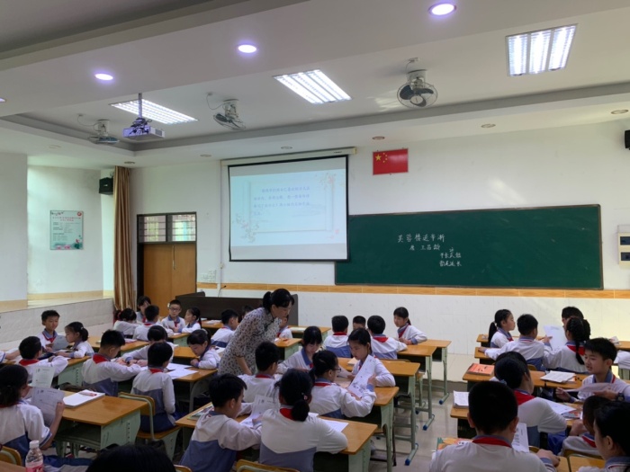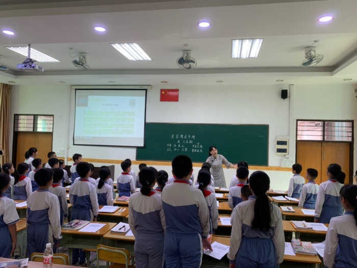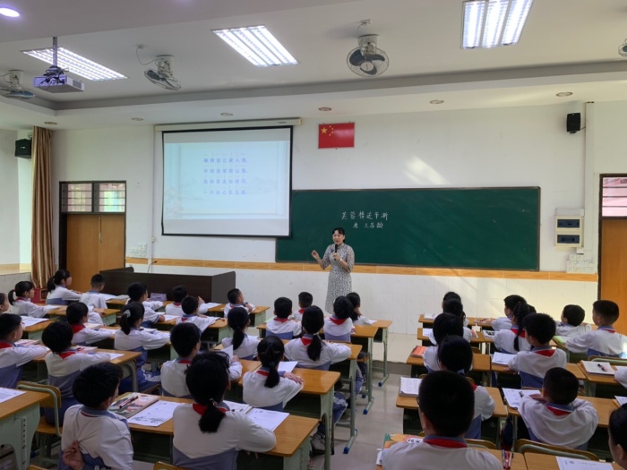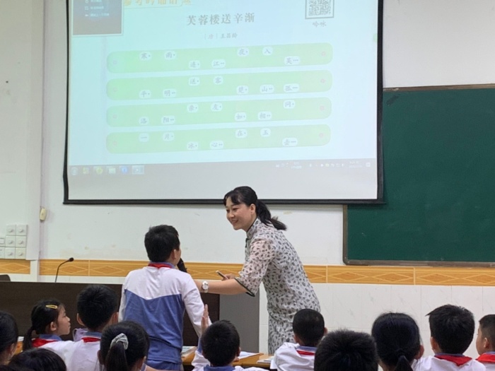 趙主任帶來的課例為語文部編版教材四年級下冊古詩《芙蓉樓送辛漸》,課堂上趙主任先以《出塞》一曲激發(fā)起同學們學習古詩的興趣,并相機進行了詩題的解釋及詩作者的介紹。為了讓同學們更好地了解古詩和傳達詩歌情感,趙主任引入了古詩吟誦的方法進行教學。為了讓學生更好地學會吟誦,趙主任精心設計,以古詩“押韻”入手,先讓學生了解平長仄短、韻尾延長的讀誦方法,再加入手勢,漸漸引導學生掌握吟誦。隨后,趙主任帶領同學們理解詩意、想象詩句描繪的畫面,在想象中學習吟誦,在吟誦中體會詩人的情感。整堂課吟誦優(yōu)美動聽,以誦促情,且悟且誦,為在場的語文老師提供了古詩吟誦教學的新思路,新方法。
