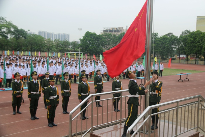 隨著莊嚴(yán)的國歌奏響,醒目的國旗手齊步前進(jìn),全體師生行注目禮,拉開了誓師大會的帷幕。