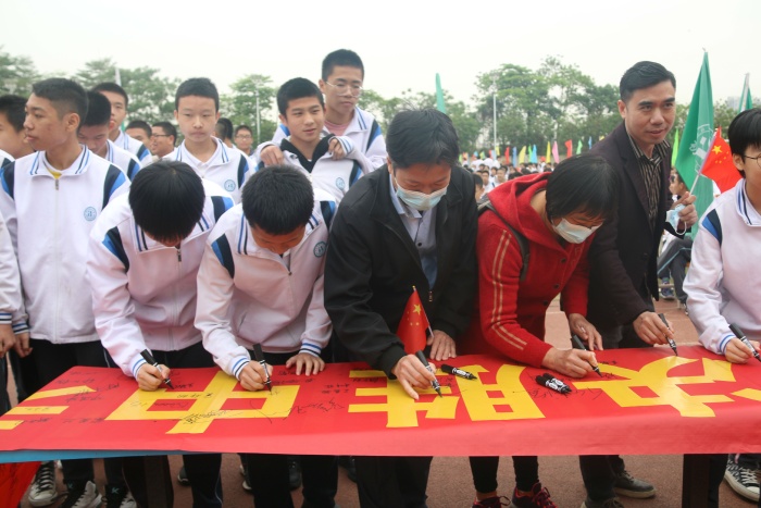 東風(fēng)吹,戰(zhàn)鼓擂;捷報飛,學(xué)子歸,又是一年備考時。為切實抓好初三級中考、初二級生地考前的教育教學(xué)工作,充分調(diào)動全體師生的工作、學(xué)習(xí)積極性,進(jìn)一步激發(fā)師生的工作、學(xué)習(xí)熱情,更好地備戰(zhàn)中考,實現(xiàn)“重點有突破、評價上檔次”的雙贏目標(biāo)。2021年3月23日上午,中山市橫欄中學(xué)黎碧東校長以及學(xué)校其他行政、初二、初三級的全體師生及家長代表在學(xué)校運動場隆重舉行“獻(xiàn)禮建黨百年,決勝中考沙場”主題中考誓師大會。