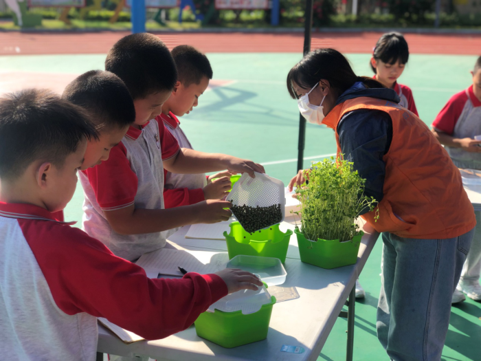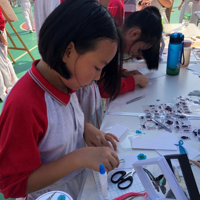 活動伊始,博凱小學兩位學生進行開場獻唱,精彩的歌唱贏得同學們的陣陣喝彩。緊接著,同學們井然有序地開始活動體驗。在科普知識展示區(qū),同學們通過圖文并茂的昆蟲知識展示牌,了解了昆蟲的特點,同時利用昆蟲標本展示盒去觀察蟈蟈、甲蟲;在有獎知識競賽區(qū),同學們以豐富的知識,成功解答各類與昆蟲相關(guān)的問題,兌換到心儀的獎品。而在昆蟲標本制作區(qū),同學們在工作人員的解說下,獨立地制作了精美的蝴蝶標本。此外,在書簽制作區(qū),同學們利用干花、昆蟲貼紙等材料,制作了許多精美的書簽。在 “無土栽培,培育豆芽”區(qū),通過圖示與工作人員的介紹,同學們享受到親手種植的樂趣,并將成品帶回去與同學、家人分享。在“微世界觀察”區(qū),同學們借助顯微鏡,觀察了常見的植物纖維,走進了新的世界。