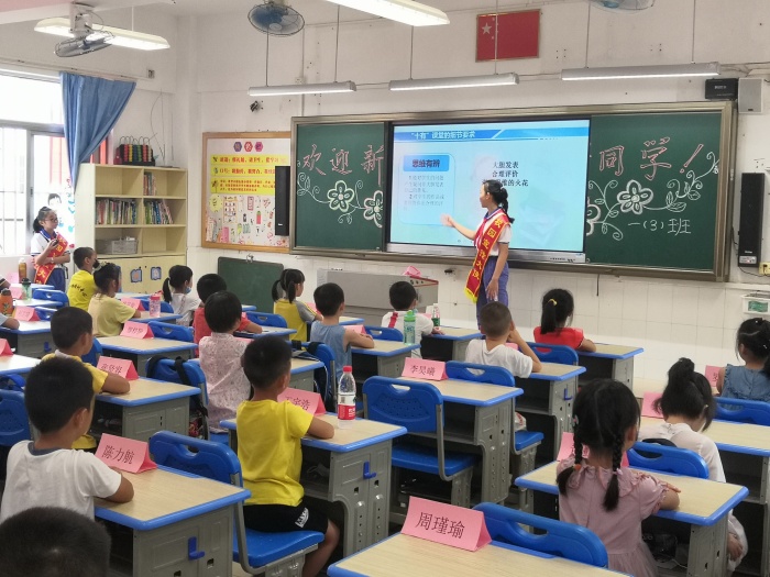 在校園宣傳大使的引領(lǐng)下,孩子們來(lái)到班級(jí)到指定位置就坐,爸爸媽媽們離開(kāi)孩子參加新生家長(zhǎng)培訓(xùn)。待正副班主任清點(diǎn)完人數(shù)后,由校園宣傳大使進(jìn)行校園一日常規(guī)和十有課堂等規(guī)范進(jìn)行宣講。緊接著,孩子們排好隊(duì)伍,宣傳大使帶領(lǐng)小朋友們熟悉校園。