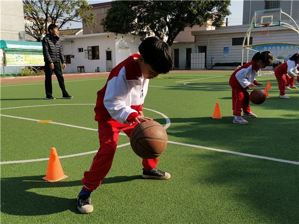 拍球比賽。一二年級的學(xué)生別看他們幼小,模樣看起來卻是有范。他們一邊拍球,一邊為自己打氣,盡管中途球被“打偏”了,但立馬就撿起來繼續(xù)拍打,認(rèn)真比賽的樣子甚是可愛。