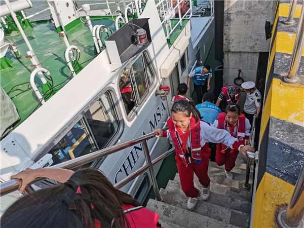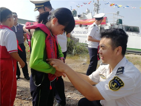 當(dāng)天,陽光明媚,天氣晴朗。下午14:00,參加活動的全體人員來到石軍濕地公園,參觀了黃圃水道石軍段,何志航處長和同學(xué)們分享了水域前后的變化。在石軍渡口,石軍村黨委書記郭宋華同志帶領(lǐng)同學(xué)們參觀渡口并介紹渡口的歷史變遷,讓同學(xué)們感受到家鄉(xiāng)日新月異的變化與為家鄉(xiāng)作貢獻(xiàn)的愿望。隨后,李浩副處長教同學(xué)們學(xué)習(xí)穿著救生衣,向同學(xué)們介紹了救生衣的組成結(jié)構(gòu),并耐心指導(dǎo)同學(xué)們穿好救生衣以后,安排全體人員井然有序地登上海巡09387船開展水上安全教育活動。