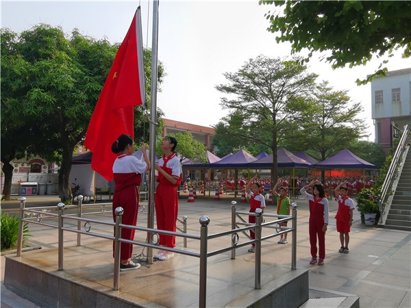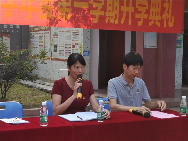 首先,石軍小學(xué)全體師生在大隊輔導(dǎo)員梁毅強老師主持下進行新學(xué)期第一次升旗儀式。隨著莊嚴肅穆的國歌聲,鮮艷的五星紅旗徐徐升起,拉開了開學(xué)典禮的序幕。