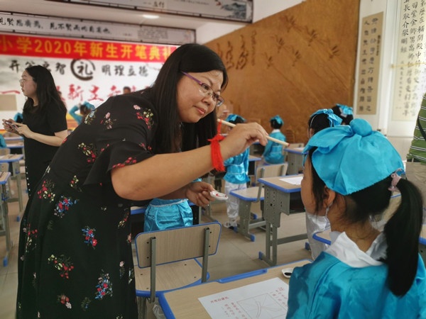 吳校長帶領(lǐng)著學(xué)校老師俯下身依次在每一個孩子的額頭正中央點一顆紅痣。“痣”通“智”,意為開啟智慧,蘊含著對新生們的美好期許。艷麗的朱砂不僅點新生的額頭上,更深深地印在了他們的心中。學(xué)校還邀請已退休教師董印生回校,為新生們擊鼓三聲,寓意深刻。