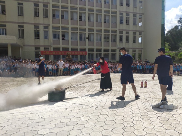 活動(dòng)最后,消防員向同學(xué)們講解了消防車的構(gòu)造和功能、模擬消防車水槍參與滅火的場(chǎng)景。除此之外,現(xiàn)場(chǎng)示范和講解滅火器的使用步驟和注意事項(xiàng),并由教師代表操作滅火器進(jìn)行現(xiàn)場(chǎng)滅火演練。