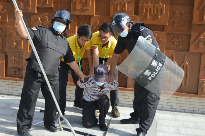 演練開始,校門外一名暴恐分子假稱學(xué)生家長(zhǎng)(上課時(shí)間不允許探望)探望小孩為由無視保安的勸阻,強(qiáng)行闖入校區(qū)并掏出兇器,尋機(jī)準(zhǔn)備傷害學(xué)生。一名保安迅速戴頭盔持戰(zhàn)術(shù)盾牌、橡膠棍、趕到現(xiàn)場(chǎng),阻止犯罪分子向?qū)W生集中處靠近,把同學(xué)保護(hù)在身后,與犯罪分子對(duì)峙,同時(shí)喊話“放下武器,不要闖入校區(qū)傷害學(xué)生?!绷硪幻0舶聪隆耙绘I式報(bào)警器”并撥通校防暴反恐組組長(zhǎng)電話報(bào)告情況。應(yīng)急小組即刻報(bào)告校長(zhǎng),啟動(dòng)應(yīng)急預(yù)案,全體師生開始迅速往安全區(qū)域逃離。各班老師立即將教室的門、窗戶關(guān)緊上鎖,并保護(hù)孩子躲避到安全區(qū)域。防暴反恐組接到警報(bào)后,手持“長(zhǎng)柄的防暴叉”、“警棍”等武器從四周沖向“歹徒”,實(shí)行截堵,并與“歹徒”周旋。經(jīng)過搏斗,最終成功將“歹徒”制服,押送派出所處理。