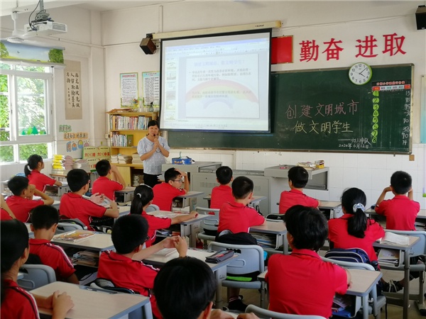 班會(huì)課上,各班主任們進(jìn)行創(chuàng)建文明城市知識宣傳,倡導(dǎo)學(xué)生們從自己做起,從小事做起,從身邊做起,爭當(dāng)文明小市民;通過PPT課件,讓學(xué)生懂得亂闖紅燈、亂吐亂扔、亂寫亂畫、亂掛亂貼是影響環(huán)境衛(wèi)生的不文明行為,希望能通過孩子對不文明行為的勸導(dǎo),潛移默化地影響大人及家庭的文明行為,從而促進(jìn)城市文明創(chuàng)建活動(dòng)的開展。