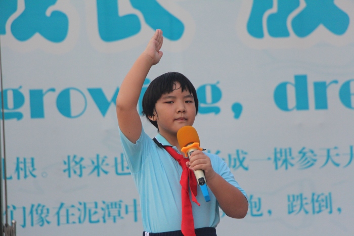 國(guó)旗下,來(lái)自502中隊(duì)的尚可馨學(xué)長(zhǎng)進(jìn)行了以《感恩老師,慶祝教師節(jié)》為題的精彩演講??绍皩W(xué)長(zhǎng)說(shuō):“老師就像蠟燭一樣,燃燒了自己,照亮了別人,默默地在自己的崗位上無(wú)私的奉獻(xiàn)著。在人生的旅途上,是老師為我們點(diǎn)燃希望的光芒,給我們插上理想的翅膀,翱翔在知識(shí)的海洋上……”,她并代表全體隊(duì)員提前祝老師們教師節(jié)快樂(lè)!