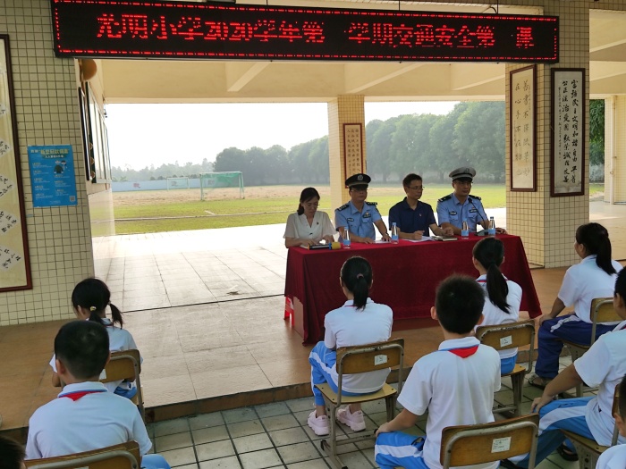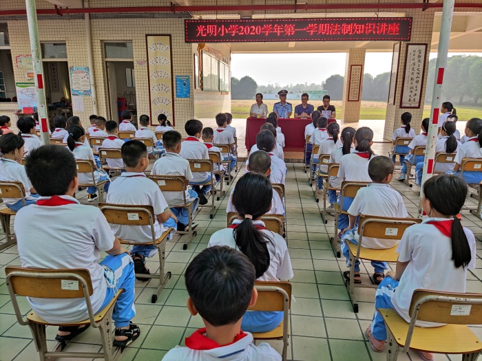 莊嚴(yán)隆重的升旗儀式拉開了開學(xué)典禮的序幕。此次開學(xué)典禮由黃麗娟副校長主持,活動共分為三個流程:首先,法制副校長黃順明警官為全體師生開展了一次法制講座。黃警官分別從防毒禁毒、保護好個人人身安全、預(yù)防新冠肺炎三方面為同學(xué)們敲響警鐘,他誠摯的話語,鮮活的案例,讓會場上響起了熱烈的掌聲。接著,由德育主任林秋影在典禮上親切講話。她熱情地歡迎了一年級的新生加入了光明小學(xué)溫暖的大家庭,也對同學(xué)們上一學(xué)年的表現(xiàn)給予了充分的肯定,同時,也對同學(xué)們提出了新學(xué)期的新要求:一是做一個誠實守信、樂于助人,講文明懂禮貌的好學(xué)生;二是自覺自愿的遵守學(xué)校的規(guī)章制度,讓文明之花在校園綻放;三是要善待自己的生命,尊重自己和他人的生命。最后,莫文杰校長為典禮慷慨致辭,他勉勵同學(xué)們要做到以下三點:相信自己、對自己負責(zé)、與人合作以及以書為友。莫校長的諄諄教誨不僅飽含著校領(lǐng)導(dǎo)對同學(xué)們的厚望,更為光明小學(xué)確立了新學(xué)期的努力方向,讓師生們倍受鼓舞和激勵。