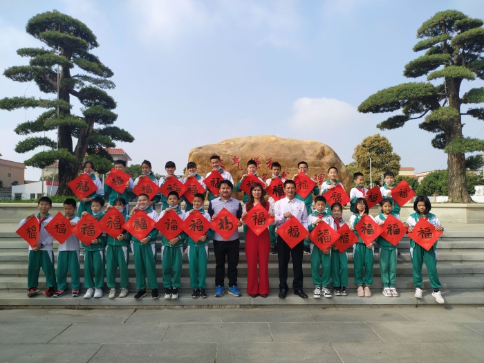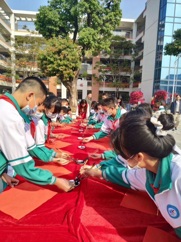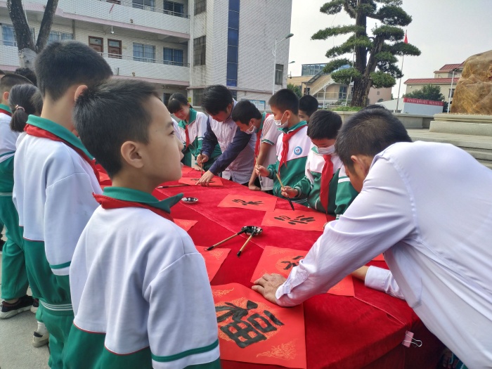 最后,由沙欄小學(xué)劉顯眾老師組織書法社團(tuán)的同學(xué)們進(jìn)行開展新春送祝?;顒?,書法社團(tuán)30多名學(xué)生在崔校長的帶領(lǐng)下現(xiàn)場書寫“?!弊郑①浰偷矫總€班級?;顒又?,師生們飽蘸香墨,慢慢運筆:一點、橫撇、一豎、一點......同學(xué)們帶著對新年的希望和祝福,寫下了自己心目中最滿意的“?!弊帧R粋€個稚拙多姿的“?!弊终宫F(xiàn)在大家面前,營造出了新春開學(xué)喜慶的濃厚氛圍,更讓孩子們感受到了中華優(yōu)秀傳統(tǒng)文化的魅力,體現(xiàn)了中國人民對傳統(tǒng)文化節(jié)日的傳承發(fā)展與美好愿景。