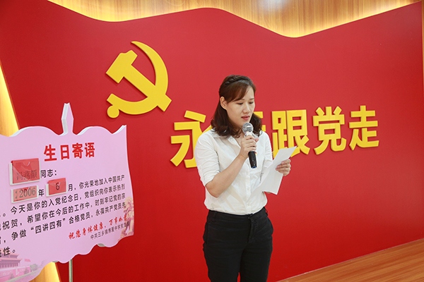 活動(dòng)中,由支部書記張政同志作簡(jiǎn)短發(fā)言,各黨員同志展開座談,接著8位6月份入黨的黨員(黃武清、丘濟(jì)新、馮燕顏、戴文慧、張秀芬、王衛(wèi)華、林蔚藍(lán)、吳春林)逐個(gè)到入黨生日祝賀牌前接受祝賀,博愛中學(xué)黨支部的5名支委分別向8位6月份入黨的黨員同志獻(xiàn)花祝賀,送上賀卡隨后黨員同志黨在黨支部書記張政的的引領(lǐng)下,重溫入黨誓詞:“我志愿加入中國(guó)共產(chǎn)黨……隨時(shí)準(zhǔn)備為黨和人民犧牲一切,永不叛黨!”鏗鏘有力的入黨誓詞在會(huì)場(chǎng)響起,震撼人心!隨后,8位黨員代表結(jié)合自身入黨經(jīng)歷,發(fā)表“政治生日心語(yǔ)”,回顧總結(jié)了自己的工作體會(huì)和思想成長(zhǎng)的感悟、收獲,他們個(gè)人的成長(zhǎng)與組織的關(guān)愛已經(jīng)融為一體,仿佛影片一般一幕幕展現(xiàn),令人感動(dòng)。