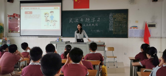 為幫助青少年樹立良好的法治觀念,增強青少年的法治安全意識,2020年10月28日上午11:20,新圩小學(xué)誠邀廣東銘興律師事務(wù)所陳路芳律師來到學(xué)校,為全體師生開展《民法典》普法宣講活動,其中四年級學(xué)生到階梯室現(xiàn)場聽課。