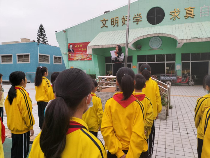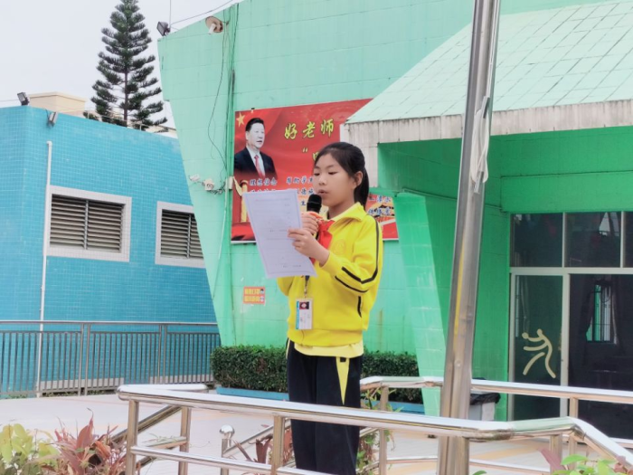 3月29日升旗儀式,華強(qiáng)學(xué)校三(六)中隊(duì)吳羽帆隊(duì)員做國(guó)旗下講話,她圍繞《清明祭先烈 紅色基因代代傳》主題,向那些建設(shè)祖國(guó)鞠躬盡瘁的模范人物致敬!接著,以清明緬懷先烈為主題,由黨員教師代表梁燕坪輔導(dǎo)員和少先隊(duì)員代表陳苗苗等隊(duì)員聲情并茂地宣講革命故事,然后帶領(lǐng)全體隊(duì)員大聲歌唱國(guó)歌,《我們是共產(chǎn)主義接班人》《娘子軍連歌》等傳頌革命英雄先烈的紅色歌謠。