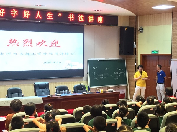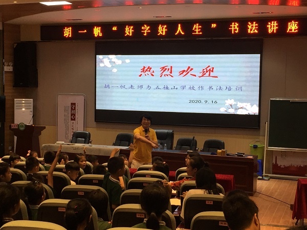 9月16下午,深圳書畫家協(xié)會副秘書長、寫字教育專家胡一帆老師蒞臨五桂山學(xué)校,對全校師生代表進(jìn)行書法培訓(xùn)。學(xué)校負(fù)責(zé)人陳玉玲、全體語文老師,各班學(xué)生代表、家長代表共計(jì)200余人參加此次培訓(xùn)。