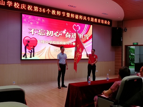 9月10日下午,五桂山學(xué)校黨支部慶祝第36個(gè)教師節(jié)“不忘初心,奮進(jìn)擔(dān)當(dāng)”主題活動(dòng)暨師德師風(fēng)專題教育培訓(xùn)會(huì)在綜合報(bào)告廳隆重舉行。五桂山黨工委副書記、人大工委主任李佳利,五桂山教育事務(wù)指導(dǎo)中心主任張立功及離退休教師代表和學(xué)校全體教職工參與本次活動(dòng)。
