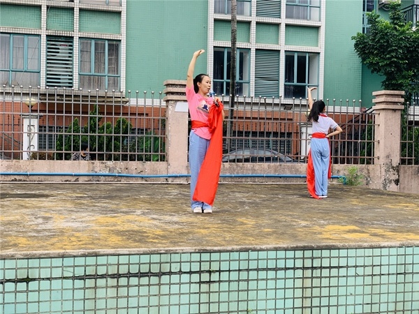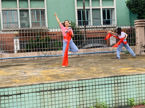 每個孩子的臉上都洋溢著燦爛的笑容,高年級的小朋友們學得快一些,動作有模有樣,踩著鼓點變化著腳步,揚起紅綢;低年級的弟弟妹妹們學得稍微慢一些,但跟著哥哥姐姐們搖擺著小手,跺著小腳,也是活力四射,精神滿滿。通過動感的音樂、豪邁的舞蹈動作,在舞蹈的過程中學生的全身心都沉浸在英雄好漢的豪邁情懷中,心中那份因疫情而沉寂的心情一下子被趕到九霄云外,因疫情而產生的小情緒都被動感的節(jié)奏所感染,孩子們個個都笑起來、跳起來、舞起來!