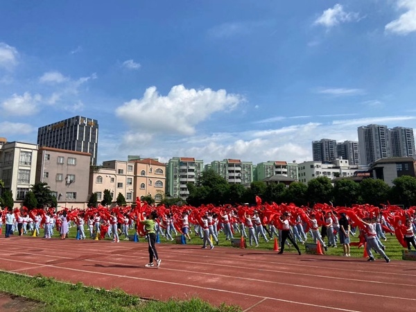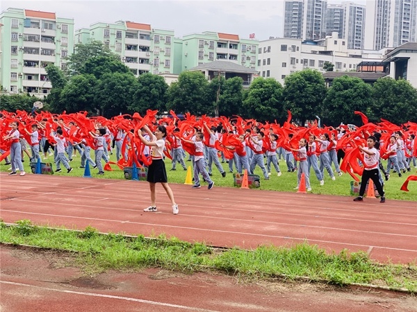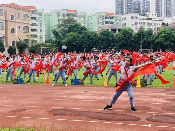 為了讓學生們進一步地了解感受水滸人物的獨特魅力,增強自身身體素質,北區(qū)小學經過研究討論,用《好漢歌》編排了一套活力滿滿,動感十足的校本操,搭配著節(jié)奏感非常強烈的歌曲,學生跳起來動感、精神。在動感、豪爽的步子中舞起腰間的紅綢帶,顫步晃頭,扭腰抖肩。整體動作爽朗風趣、活潑大方。搭配上熱情豪邁的《好漢歌》,既能感受到水滸英雄的疏朗豪情,又能很好地鍛煉身體,每日大課間鈴聲響起時,他們便會迫不及待地拿出屬于自己的紅綢帶,迅速地排好隊集中在操場上,跟隨著彭靜老師的口令學習集體舞動作。驕陽如火,孩子們手中的紅綢舞動起來,連成一片紅色的海洋。