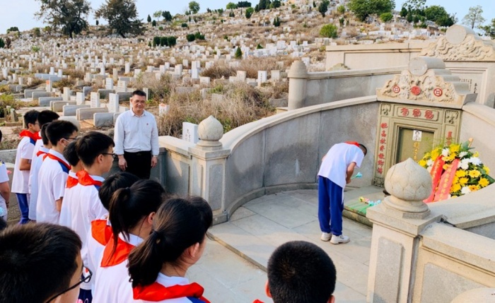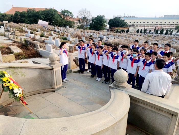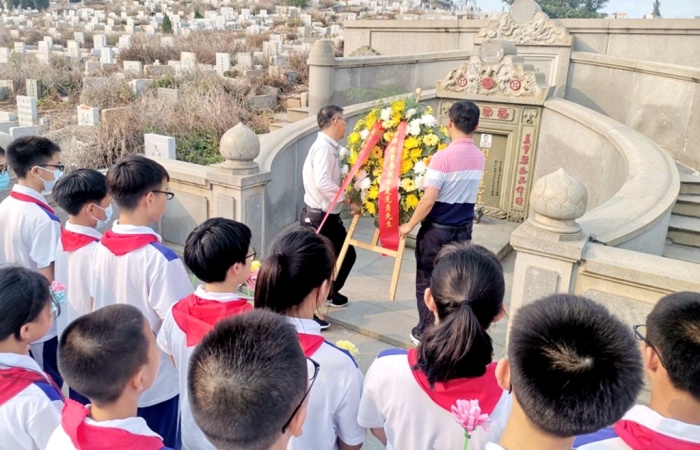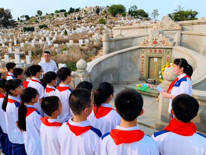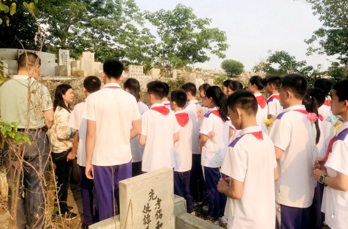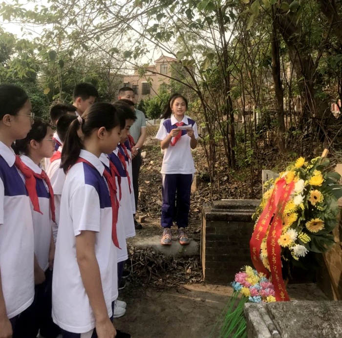 活動(dòng)分為兩小組,第一小組由楊青華副校長(zhǎng)帶隊(duì)前往永寧鄉(xiāng)前黨總支部書(shū)記李漢章先生的墓前。同學(xué)們獻(xiàn)上花圈和自做的紙花,瞻仰墓碑。羅結(jié)晶副主任介紹了老書(shū)記在永寧農(nóng)業(yè)合作化期間組織開(kāi)創(chuàng)領(lǐng)導(dǎo)班子“入黨為公、掌權(quán)為民,為黨爭(zhēng)輝、為民造?!保弧耙恍臑楣?,艱苦奮斗,拼搏進(jìn)取,無(wú)私奉獻(xiàn)”的永寧人精神。李漢章為永寧打下了堅(jiān)實(shí)的經(jīng)濟(jì)基礎(chǔ),也為永寧人留下了寶貴的精神財(cái)富。改革開(kāi)放后,永寧人代代相傳,永寧事業(yè)不斷發(fā)展。1985年,永寧鄉(xiāng)成為廣東省最早的“億萬(wàn)富翁”。李漢章老書(shū)記在工作中甘當(dāng)“為人民服務(wù)的孺子牛”、“創(chuàng)新發(fā)展的拓荒牛”、“艱苦奮斗的老黃?!薄钋嗳A副校長(zhǎng)也勉勵(lì)少先隊(duì)員們要珍惜今天來(lái)之不易的幸福生活和良好的學(xué)習(xí)環(huán)境,刻苦學(xué)習(xí)奮發(fā)成才,在中國(guó)共產(chǎn)黨建黨100周年和十四五規(guī)劃的開(kāi)局之年,發(fā)揚(yáng)“三牛”精神,在全面建設(shè)社會(huì)主義現(xiàn)代化國(guó)家新征程上奮勇前進(jìn),貢獻(xiàn)力量。