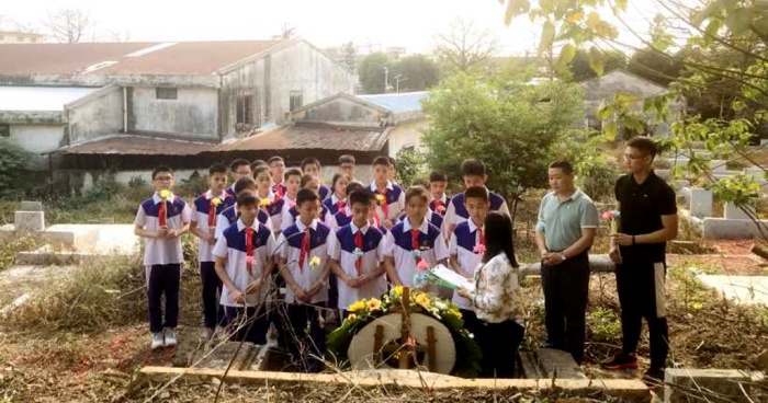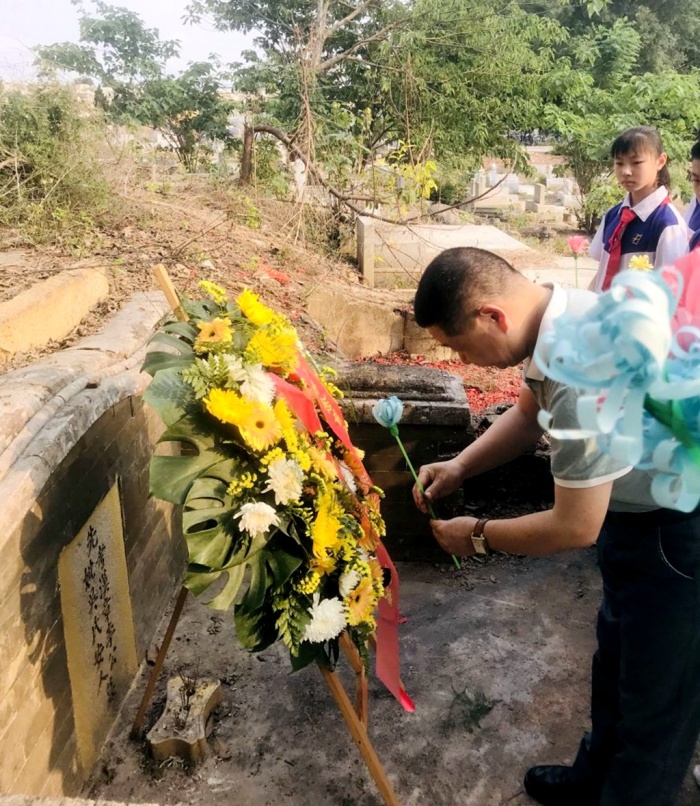 第二小組由戴放良主任帶隊(duì)前往永寧中學(xué)名譽(yù)校長(zhǎng)麥克貞先生的墓前。同學(xué)們首先獻(xiàn)上了花圈和紙花,瞻仰墓碑。接著,戴主任介紹了麥克貞先生事業(yè)有成回報(bào)家鄉(xiāng)的一片愛(ài)心。號(hào)召同學(xué)們學(xué)習(xí)麥克貞先生的家國(guó)情懷。