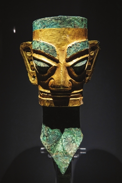 在三星堆博物館拍攝的“戴金面罩青銅人頭像”,1986年從三星堆2號“祭祀坑”出土。