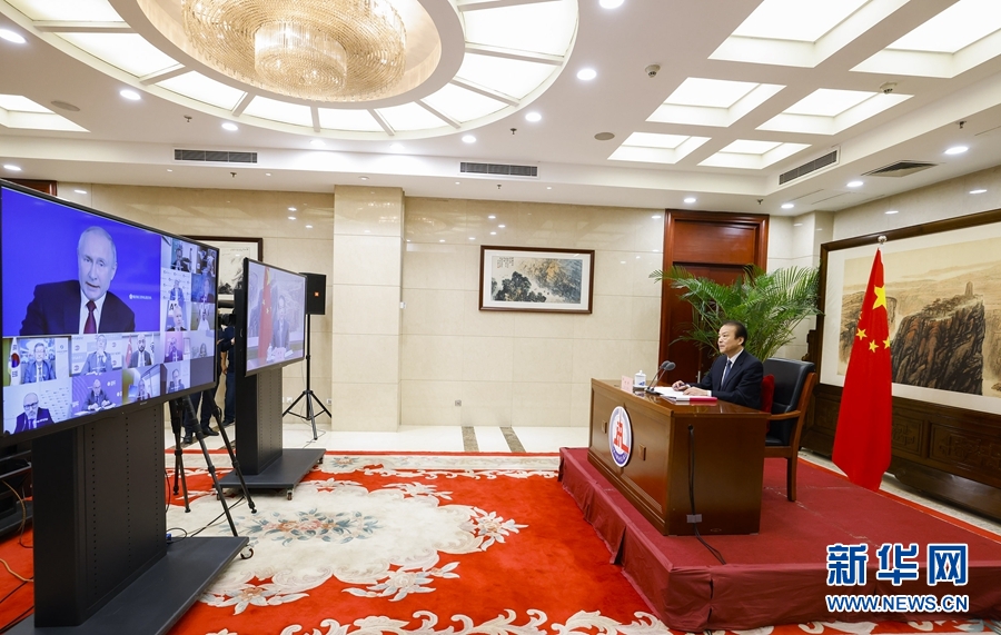 6月5日,新華社社長(zhǎng)、總編輯何平在北京通過視頻連線出席俄羅斯總統(tǒng)普京會(huì)見世界主要通訊社負(fù)責(zé)人活動(dòng)。這是普京在回答何平的提問。新華社記者 黃敬文 攝