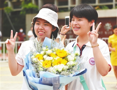 12時(shí)20分,市實(shí)驗(yàn)中學(xué)門前的東江路兩旁停滿了車。梁先生夫婦帶著小兒子正在等待女兒黃美禎走出校門。“祝賀同學(xué)們,考完啦!”一位穿紅色衣服的老師站在校門口熱情地向走出校門的同學(xué)們喊著。5分鐘后,黃美禎拖著行李箱出現(xiàn)在校門前,弟弟高興地跳起,把花遞給姐姐?!敖憬阕x了十幾年書了,真的很辛苦,高考完,我們家長(zhǎng)也如釋重負(fù)?!秉S女士向記者表示,當(dāng)晚會(huì)好好慶祝女兒高考結(jié)束。