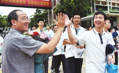 市一中考點(diǎn),高三(15)班的物理老師汪老師與學(xué)生擊掌道別。