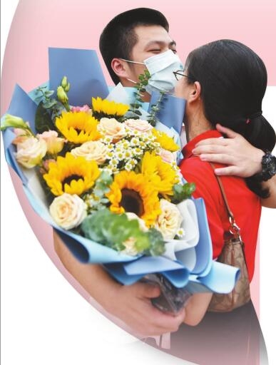 家長(zhǎng)給孩子送花,緊緊相擁。