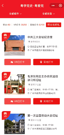 廣大黨員干部群眾隨時(shí)隨地拿起手機(jī)掃描二維碼或在微信小程序搜索“打卡廣東紅”,即可進(jìn)入頁面,通過線上或線下實(shí)地打卡等方式,馬上進(jìn)入上百個(gè)重要地標(biāo)、重要革命遺址、重大事件發(fā)生地、革命紀(jì)念館等參觀學(xué)習(xí),或看或聽,或進(jìn)或出,輕松自如。