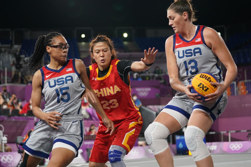7月26日,中國隊(duì)球員王麗麗(中)在比賽中拼搶。新華社記者 張笑宇 攝