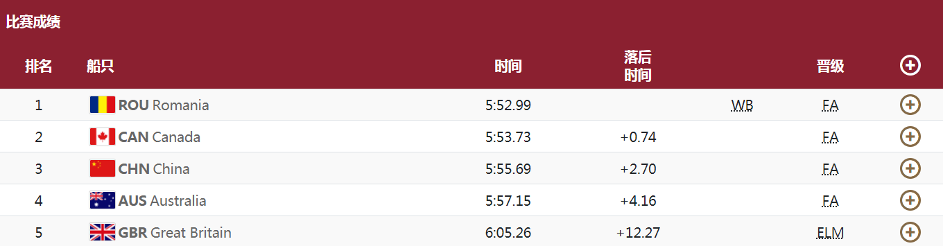 不過在1500米計時點連遭加拿大和羅馬尼亞逆轉,中國賽艇組合成績是4分26秒77跌至第3,最終在終點定格成績至5分55秒69鎖定前3晉級決賽。羅馬尼亞組合耗時5分52秒99率先撞線,同時在奧運會復活賽創(chuàng)造出世界最好成績值得關注,第2和4名分別是加拿大5分53秒73和澳大利亞5分57秒15,反觀英國成績是6分05秒26墊底被淘汰出局。