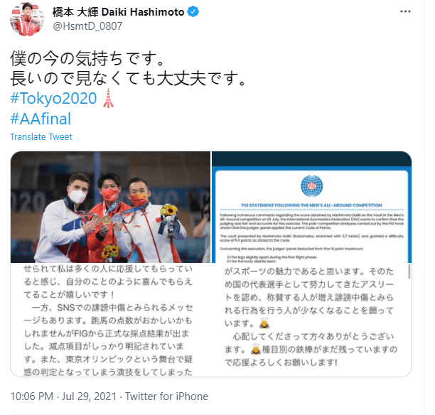 隨后,橋本大輝也在自己的個(gè)人社交媒體賬號(hào)上發(fā)文回應(yīng)此事,他發(fā)了一張三位獲獎(jiǎng)選手的合影和打分明細(xì)的圖片并配以長(zhǎng)文。橋本大輝寫(xiě)道:“這兩天我收到了人們的贊美、同時(shí)也在網(wǎng)上聽(tīng)見(jiàn)了很多誹謗和中傷的聲音。這次我(單腳踩出界)的14.7分的分?jǐn)?shù)雖然讓人覺(jué)得存在疑問(wèn),但是這個(gè)項(xiàng)目得扣分情況已經(jīng)清楚地列出來(lái)了。我們運(yùn)動(dòng)員都一樣,在比賽中必須要面對(duì)嚴(yán)格的評(píng)判和分?jǐn)?shù),這次比賽也是如此,分?jǐn)?shù)都是客觀給出、而不是主觀打分的,我相信所有在場(chǎng)選手也都知道這些規(guī)則。雖然奧運(yùn)會(huì)還在繼續(xù),但是能夠在臺(tái)上和大家比拼已經(jīng)是我很寶貴的經(jīng)歷,互相切磋、互相贊美,這就是體育比賽的魅力所在。因此,我希望贊美奧運(yùn)運(yùn)動(dòng)員的人可以更多、而攻擊謾罵的聲音可以變得更少?!?/p>