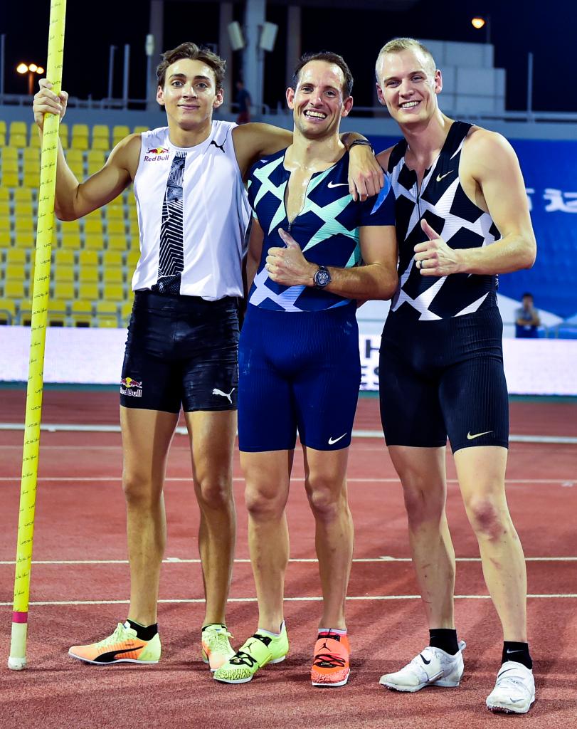 資料圖:2020年9月25日,美國選手肯德里克斯(右)在2020世界田聯(lián)鉆石聯(lián)賽多哈站男子撐桿跳高比賽中獲得亞軍。新華社發(fā)(尼庫攝)