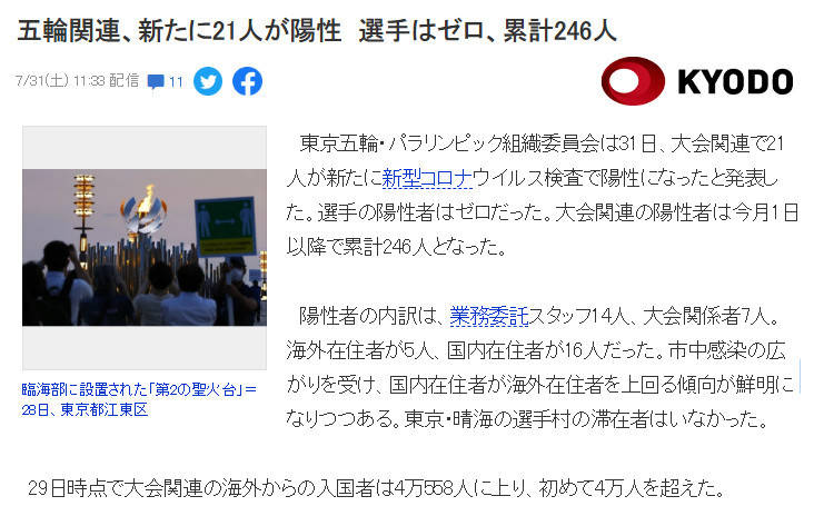 北京時(shí)間7月31日消息,據(jù)日本共同社報(bào)道,東京奧運(yùn)會和殘奧會組委會在31日宣布,奧運(yùn)會相關(guān)人員共21人檢測出新冠陽性,累計(jì)人數(shù)已達(dá)到246人。