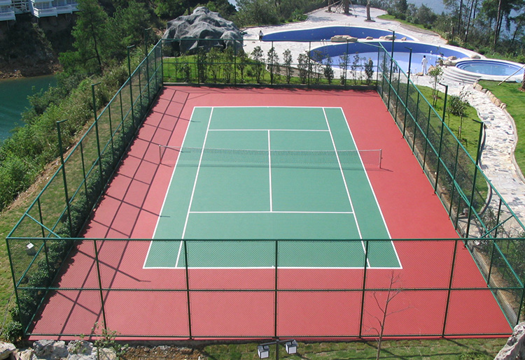(3)彈性層:用丙烯酸粗彈性層涂料兌水充分?jǐn)嚢韬笥孟鹉z刮耙全場刮涂兩遍,增加球場彈性。