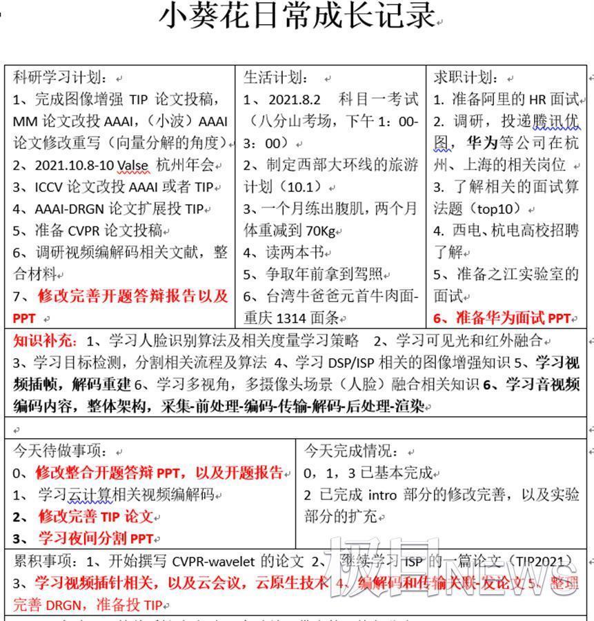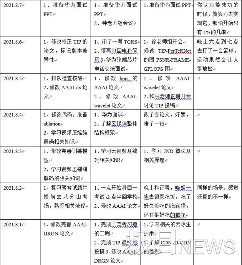 “我在完成一篇論文的時(shí)候,已經(jīng)在寫下一篇論文了,同時(shí)還在做下下篇論文設(shè)想驗(yàn)證。這樣時(shí)間是連續(xù)的,形成一個(gè)閉環(huán),中間不會(huì)有空窗期。而且還可以及時(shí)發(fā)現(xiàn)存在的問題,互補(bǔ)優(yōu)化?!苯f,他每天都會(huì)把所有需要完成的事情按照重要程度排序,細(xì)分到每一天的早、中、晚,合理分配在自己的時(shí)間記錄表里。每天晚上,他會(huì)對照時(shí)間表進(jìn)行總結(jié),查找遺留問題,并記錄一些自己的想法。