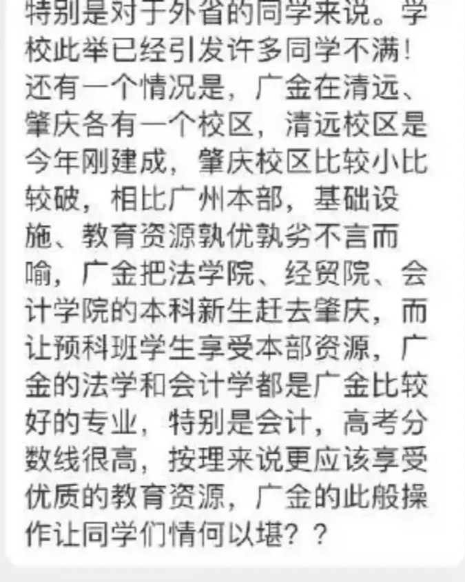 廣金在清遠、肇慶都有1個校區(qū),清遠校區(qū)今年才建成,相比廣州本部,清遠基礎(chǔ)設(shè)施、教育資源還不能與本部相提并論,肇慶校區(qū)比較破。