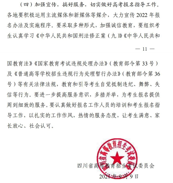 2021年9月14日,四川省高等教育招生考試委員分發(fā)布“關(guān)于做好我省2022年普通高考報名工作的通知”,就2022年統(tǒng)考、高考事宜進行了說明。詳情如下: