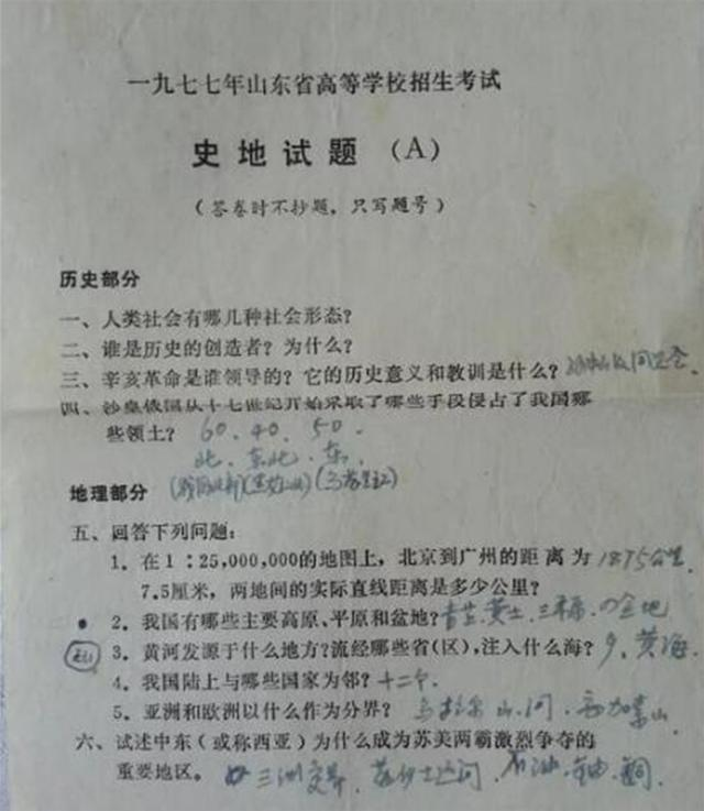 最后我們再來看一下歷史和地理試卷,1977年山東省高考將這兩科放在一起考,兩科一共才占了一面紙,再一看題目,都是最基礎(chǔ)的知識(shí)點(diǎn),如果現(xiàn)在高考這么考,估計(jì)滿分的考生占比能超過一半。