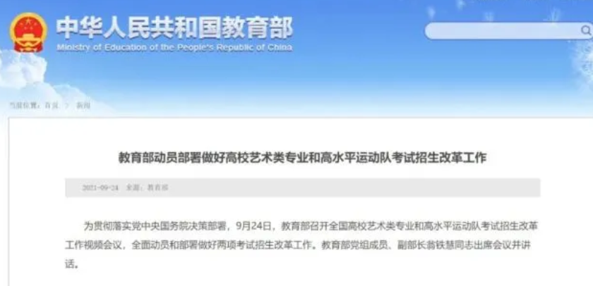 9月24日教育部召開藝術(shù)類專業(yè)和高水平運動隊招生改革工作會議,會議中針對藝術(shù)類和體育類高校專業(yè)招考進行了重新規(guī)劃。