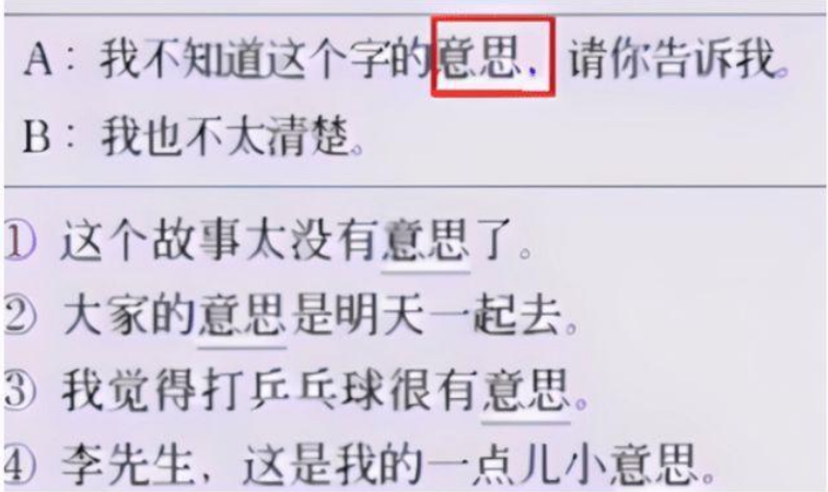 “意思”這個(gè)詞,可以有多種意思。選項(xiàng)中的四個(gè)“意思”,需要細(xì)細(xì)琢磨才能分辨出來(lái)。一個(gè)代表興趣、一個(gè)代表想法:一個(gè)表示有趣,一個(gè)表示心意。
