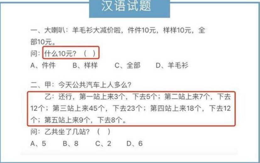 三個(gè)字有不同的詞性,在句子中占據(jù)不同的位置。若是沒(méi)有良好的漢語(yǔ)基礎(chǔ),這道題只能靠猜。選擇題還算友好,至少有三分之一的概率能答對(duì)。