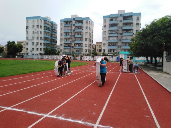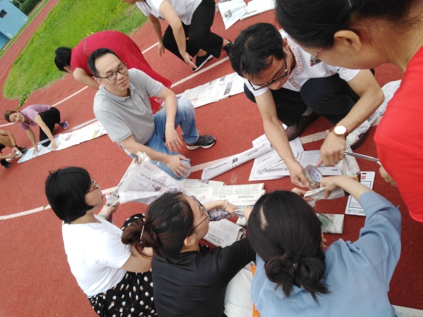 然后全體老師到達(dá)運(yùn)動(dòng)場開始活動(dòng)。隨著哨聲響起,各組隊(duì)員馬上分工合作:有的指揮、有的折報(bào)紙、有的粘膠帶。很快就做出了報(bào)紙大圓環(huán)、全組隊(duì)員在圓環(huán)里面滾動(dòng)到達(dá)終點(diǎn)。每一個(gè)環(huán)節(jié)都牽動(dòng)著隊(duì)員的心弦,同呼吸,共命運(yùn),彼此加油、歡呼、鼓勁,讓身心得到放松。