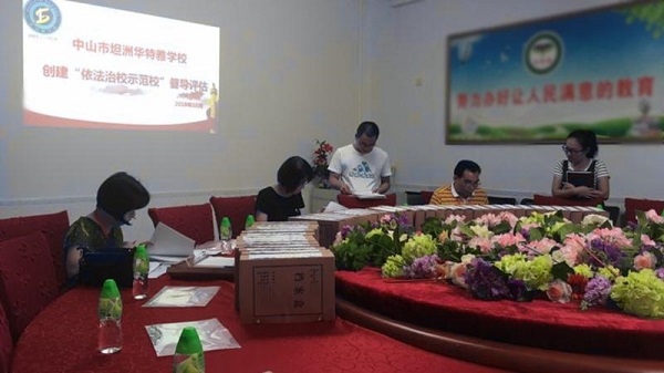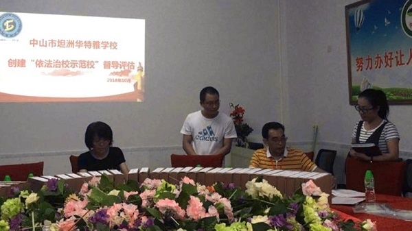 2018年10月8日,坦洲鎮(zhèn)教育事務(wù)指導(dǎo)中心黃華福副主任率領(lǐng)督導(dǎo)檢查組,對坦洲華特雅學(xué)校申報中山市依法治校示范校進(jìn)行核查認(rèn)定。
