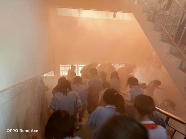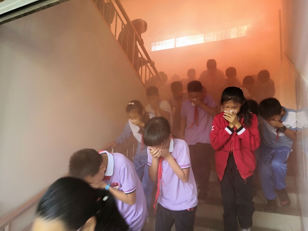 隨著煙霧升起、消防警報(bào)聲的響起,各班教師依據(jù)疏散路線快速、有序地帶領(lǐng)學(xué)生用濕毛巾捂住口鼻、彎下身體,沉著有序,在短短幾分鐘里全校六百多名學(xué)生全部撤離到了規(guī)定的安全地點(diǎn),收到預(yù)期的效果。